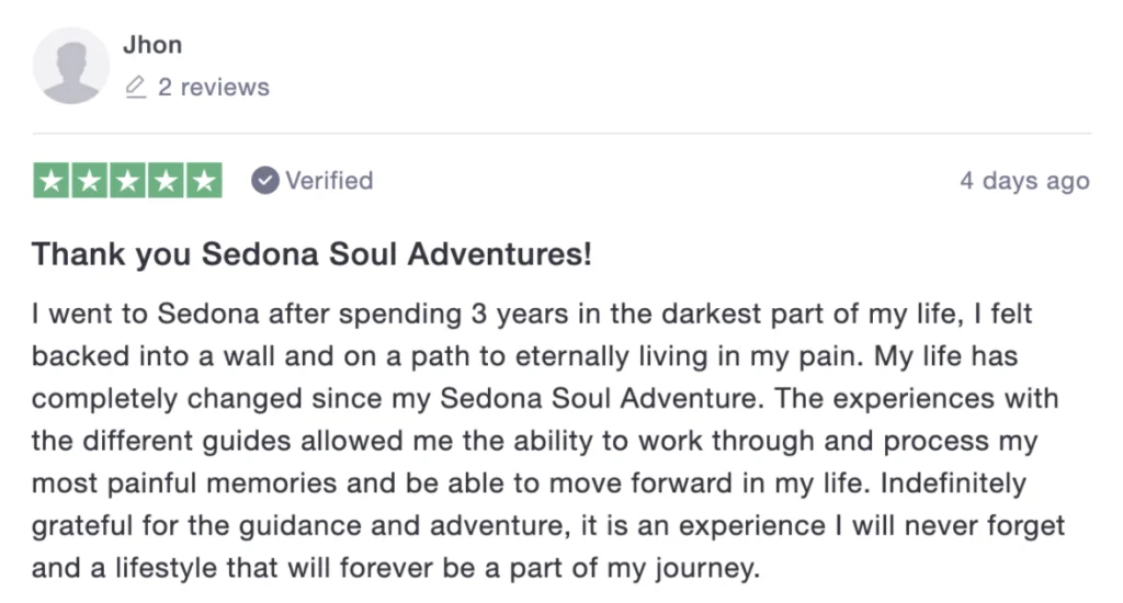 We have over 50 Master Practitioners who are the best of the best here in Sedona – no one else even comes close. We’ll design the perfect Soul Adventure where you’re working one-on-one (or two-on-one for Couples) to have the same kind of astounding, amazing life-changing transformation that Jhon had.