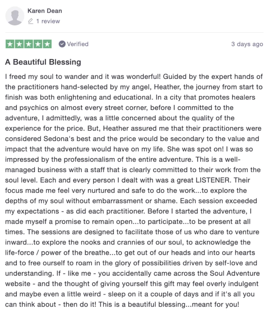 Karen says she was skeptical (especially about the price), but her Soul Adventure “went to the depths of my soul” and “exceeded my expectations”