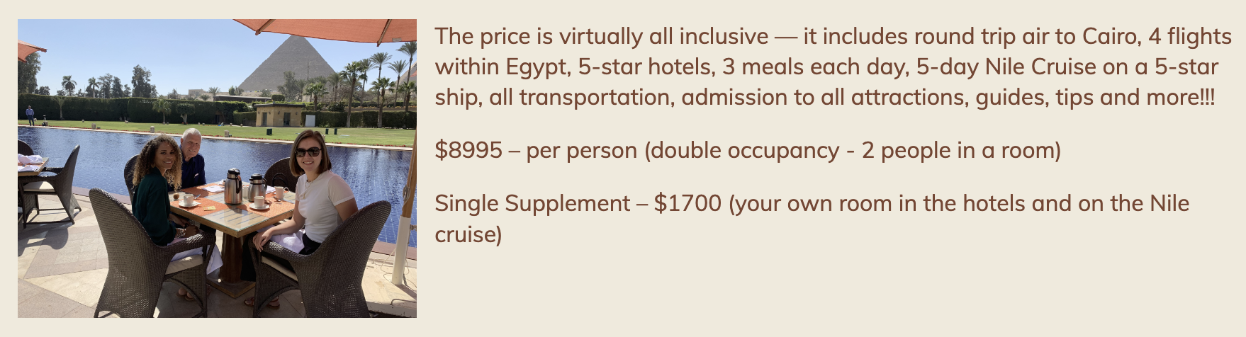 This will be my 23rd (!) trip to Egypt, isn’t that incredible? It’s just so fantastic — seeing the Pyramids, the Sphinx, Abu Simbel, The Isis Temple at Philae, sailing on the Nile on our 5-star ship, our 5 star hotel right next to the Pyramids (see the photo below), traveling with other like-minded adventurers, it’s just such a huge gift to yourself.